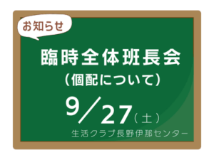 【 日時 】 2025年9月27日(土) 10時~ 【 場所 】 生活クラブ長野伊那センター 【 内容 】 ・「個配」について出された意見の共有 ・今後の具体的な進め方について (導入スケジュール、配達 […]