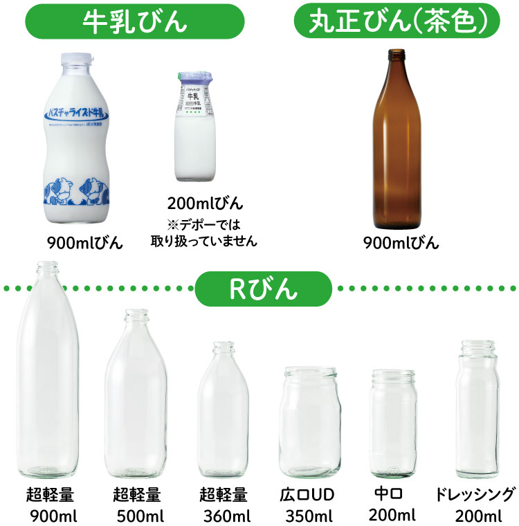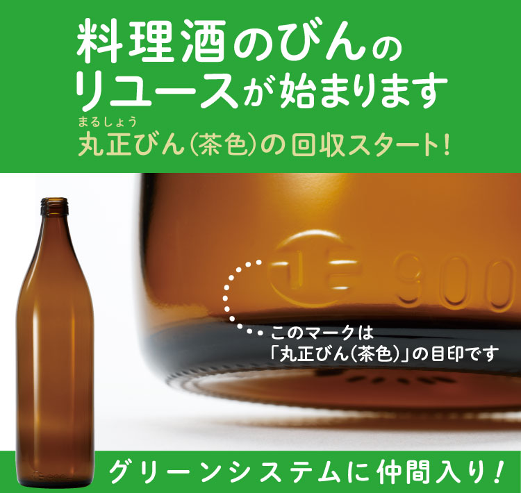 新たに回収できるようになったびんは、料理酒の茶色の900mlびんです。Rびんと同じように「丸正びん(茶色)」として規格統一されている証に「丸正マーク」がついているのが特徴です。